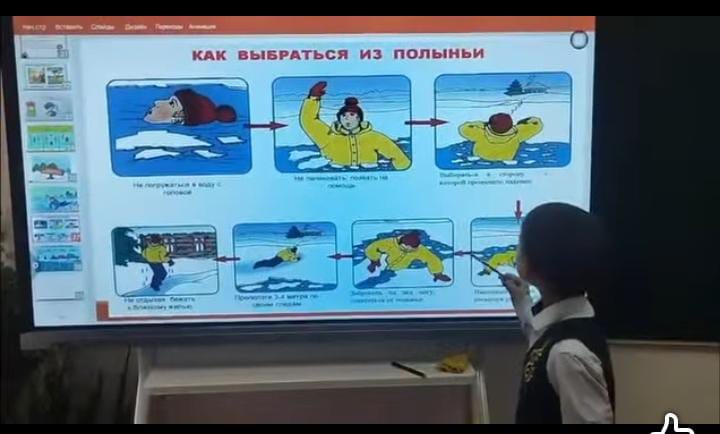 Урок начался с беседы. Обсуждали вопрос "Почему лёд может быть опасным?" Ученики вспомнили, какие угрозы могут возникнуть на льду. Чтобы закрепить знания,детям было показан видеоролик, где узнали о признаках тонкого и толстого льда и как стоит вести себя если случайно провалился под лёд.