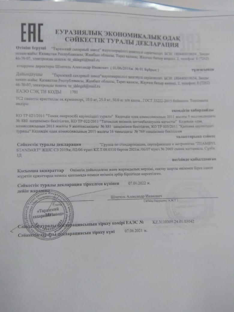 Тамақ өнімдерінің сертификаты: шәй, тұз, шекер, қант